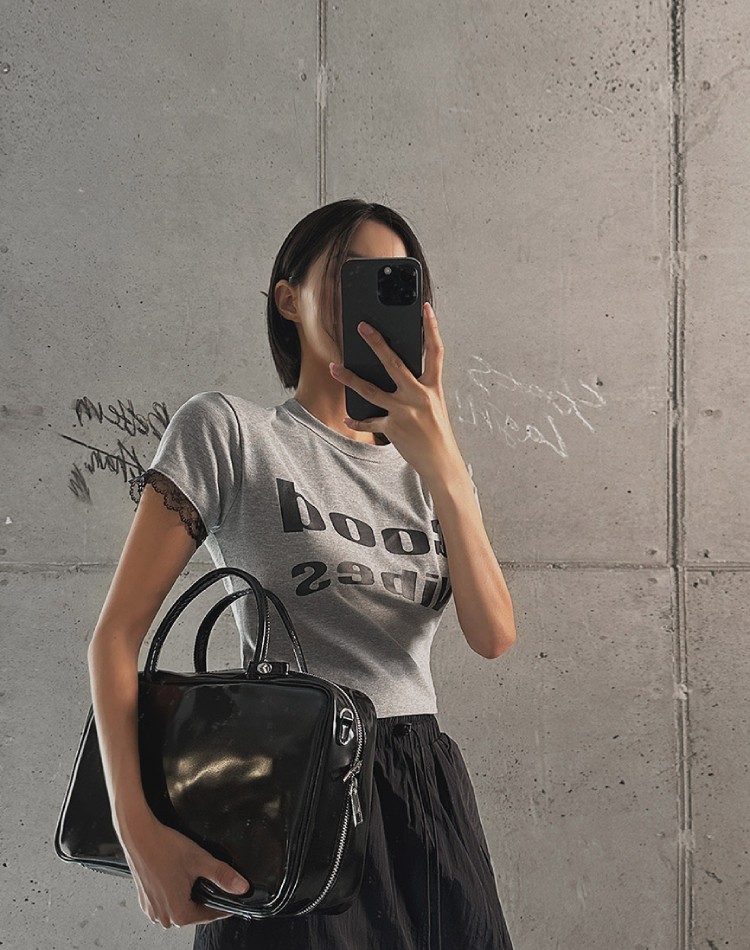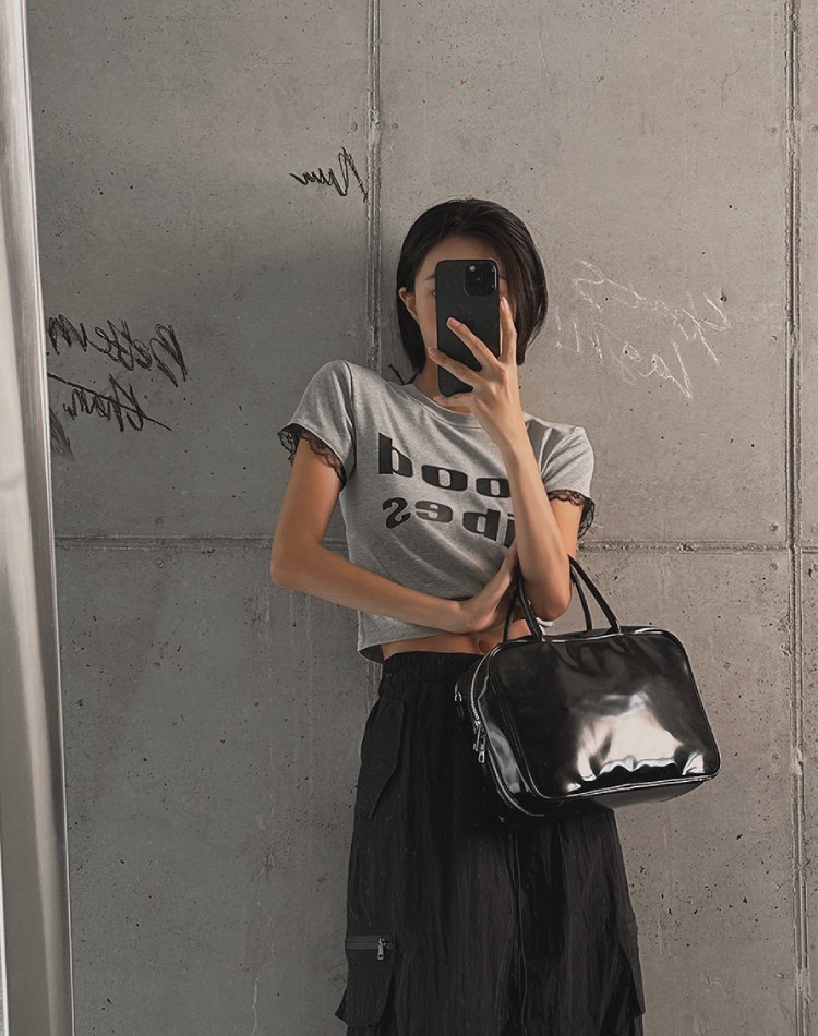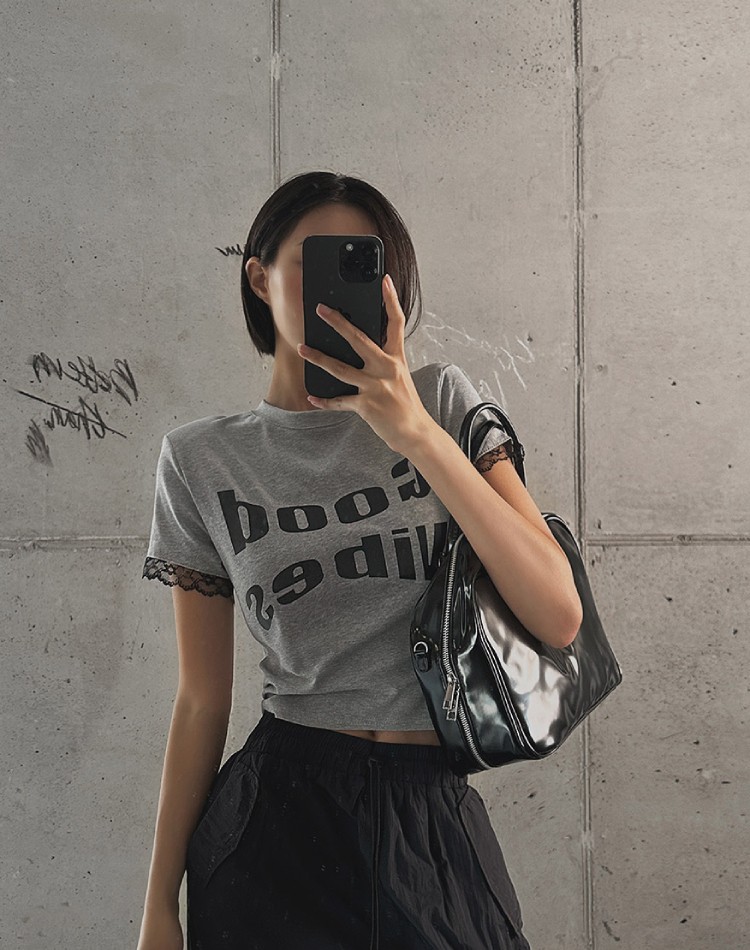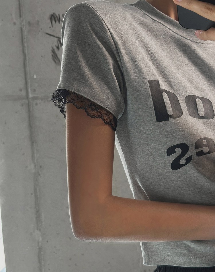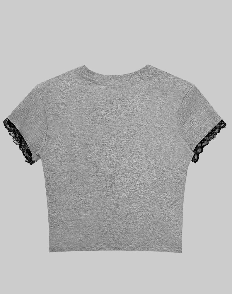 Sweet and Chic: A basic gray T-shirt is paired with black lace cuffs for a sweet yet chic look.