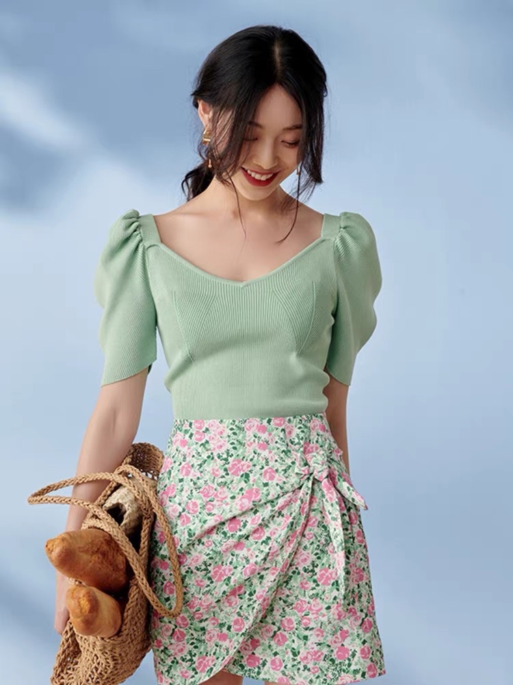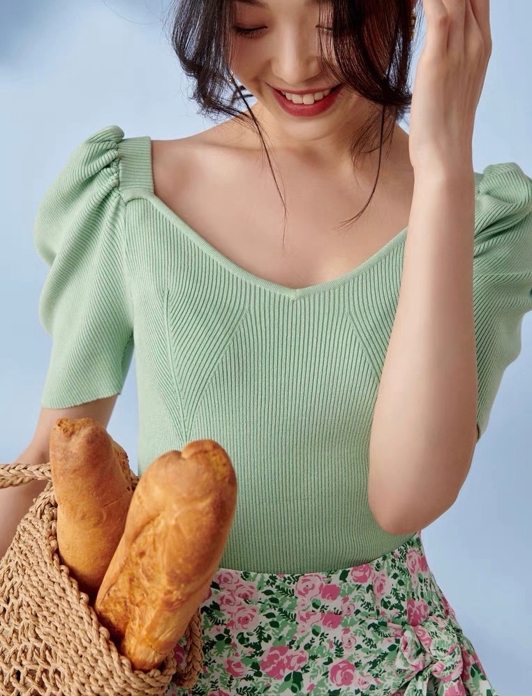 Grass Green V-neck Slim-fit Puff Sleeve Sweater