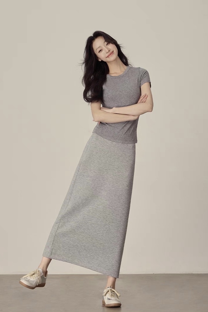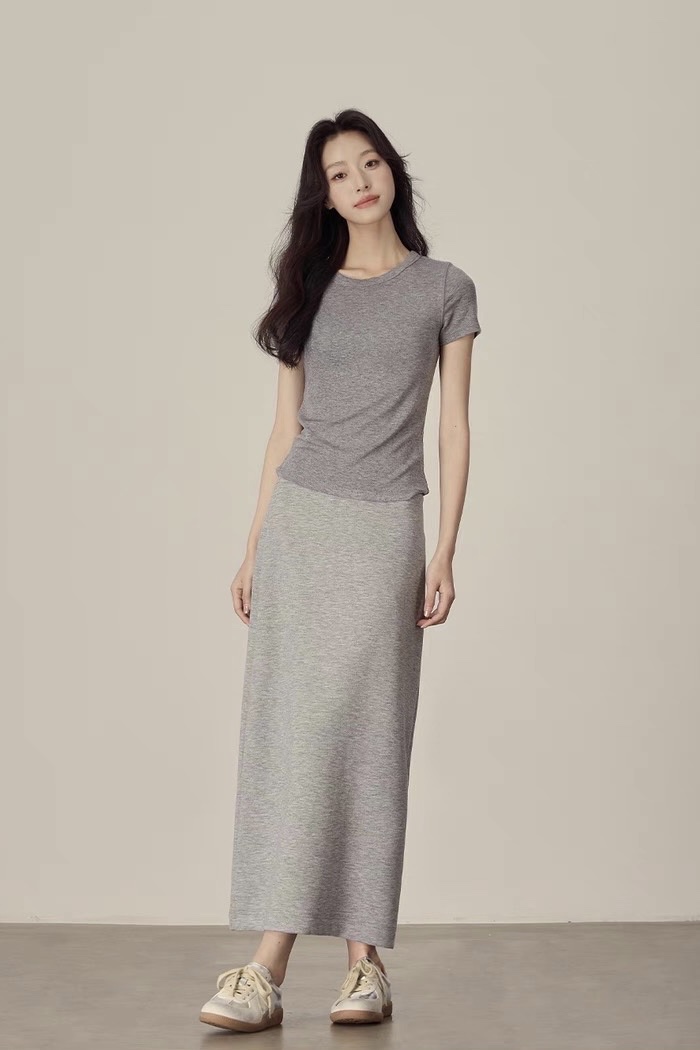 A simple and casual light gray skirt that can be worn for daily outings and commuting.
