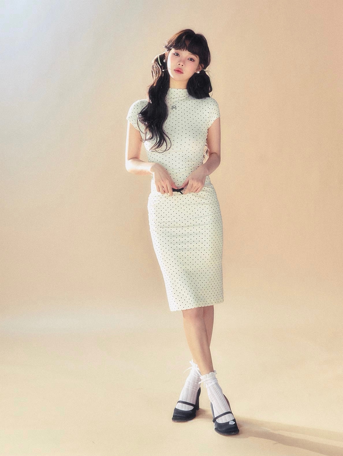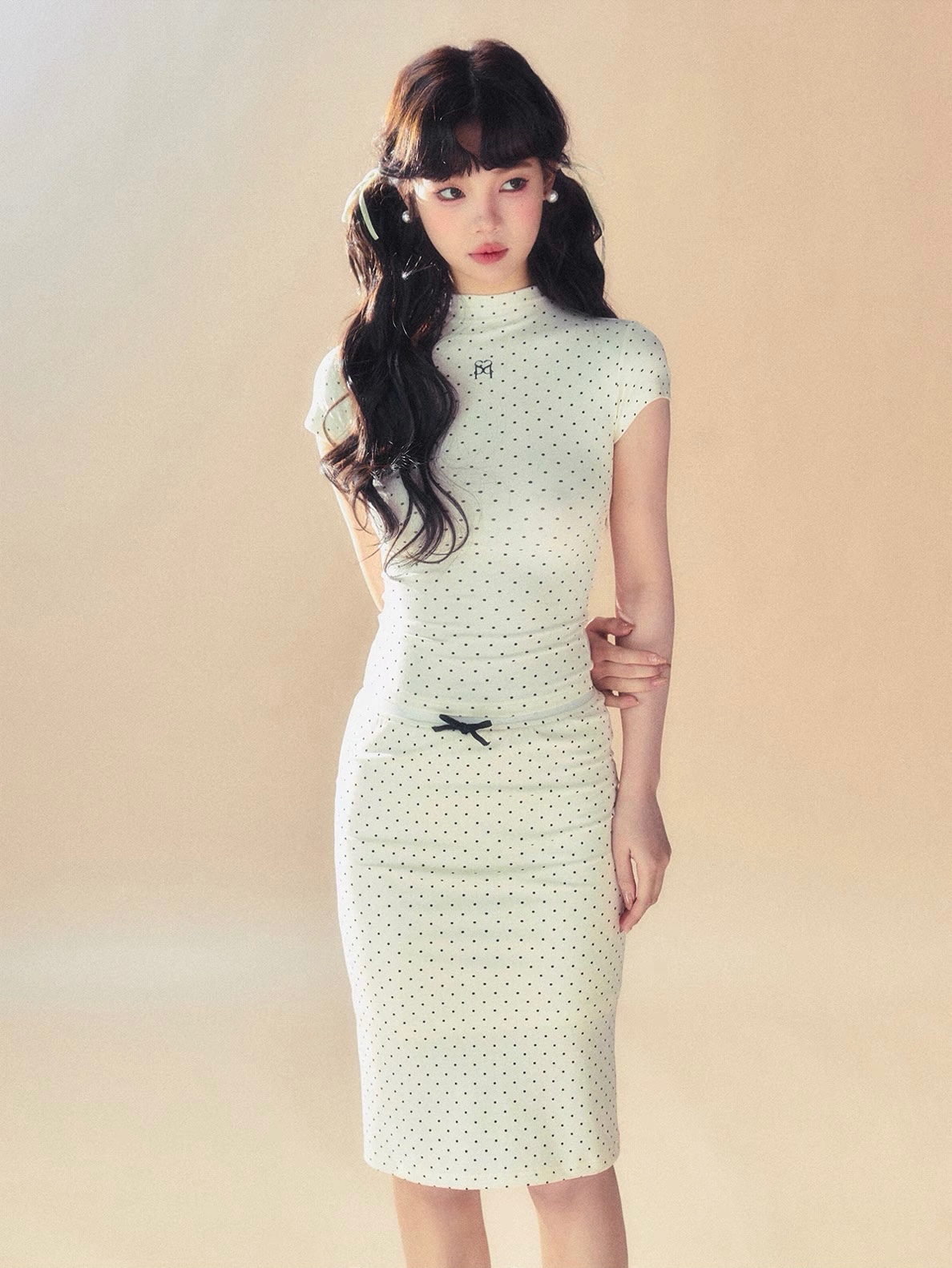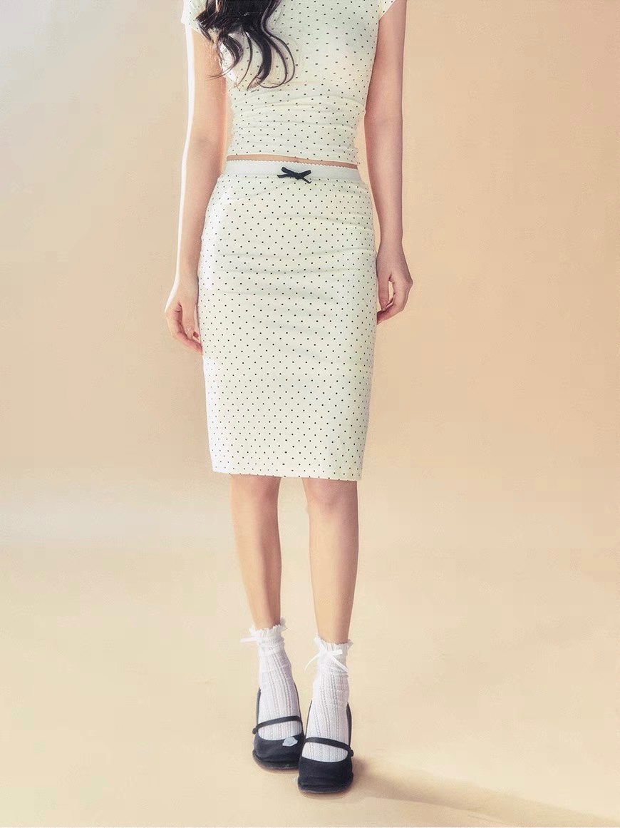 The skirt is elastic, with a simple basic style embellished with polka dots, which makes it look more energetic.