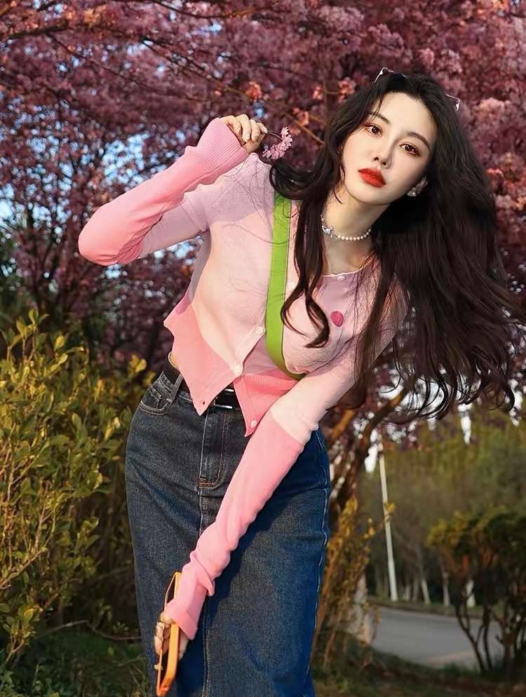 Pink Patchwork Sweater Autumn Long Sleeve Top