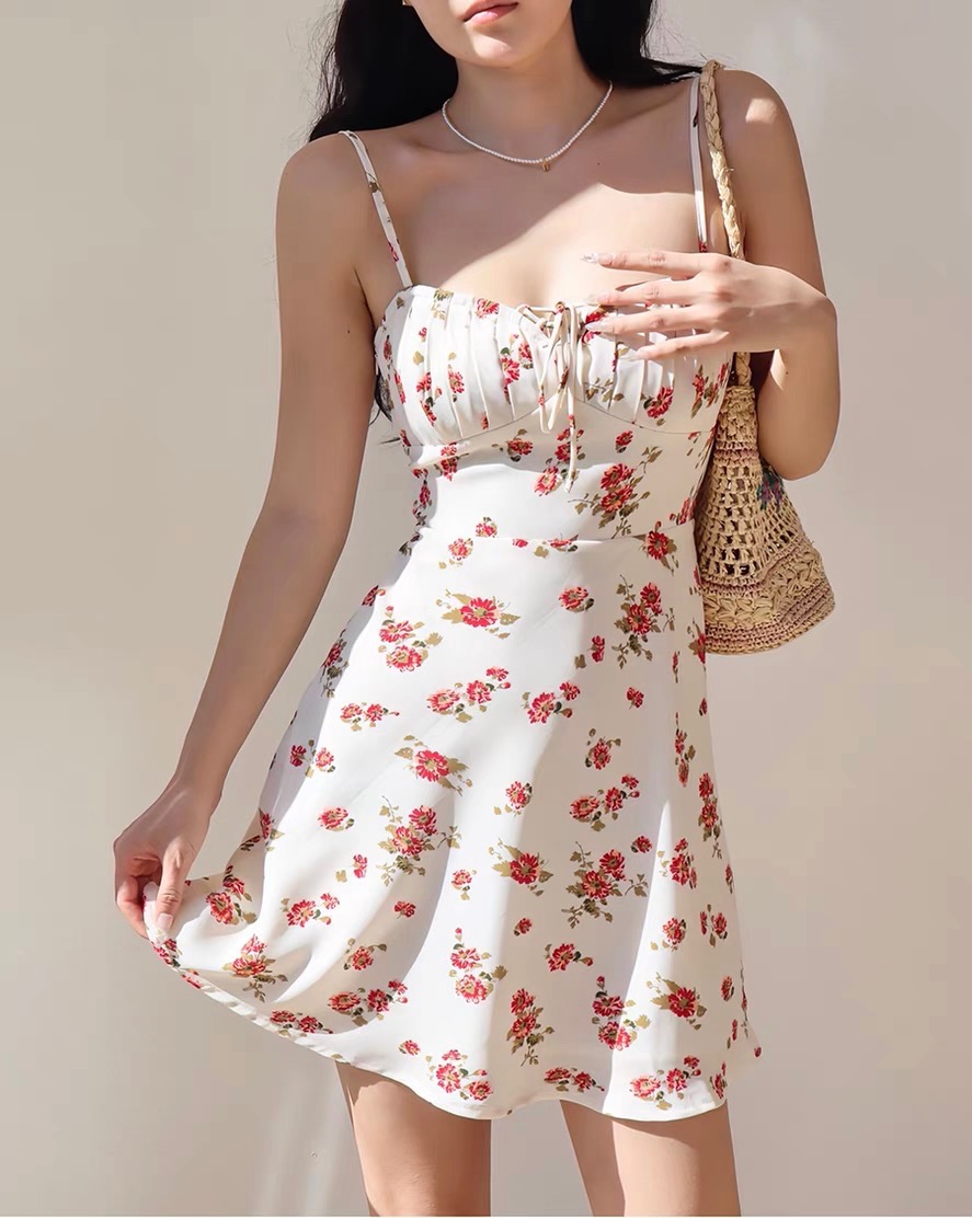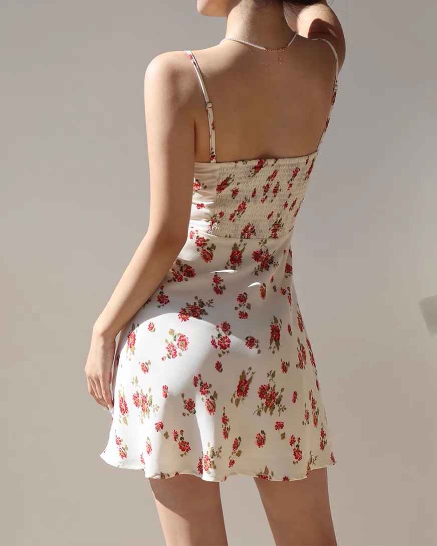 Retro Small Floral Sexy V-Neck Waist Tie Suspender Dress