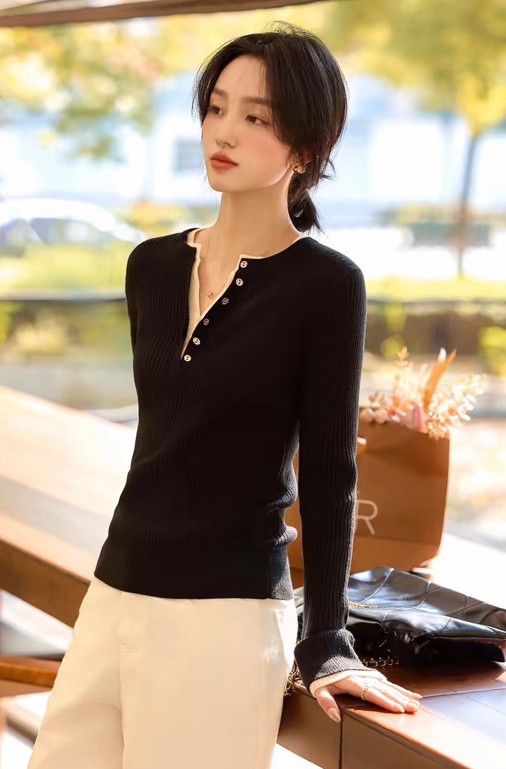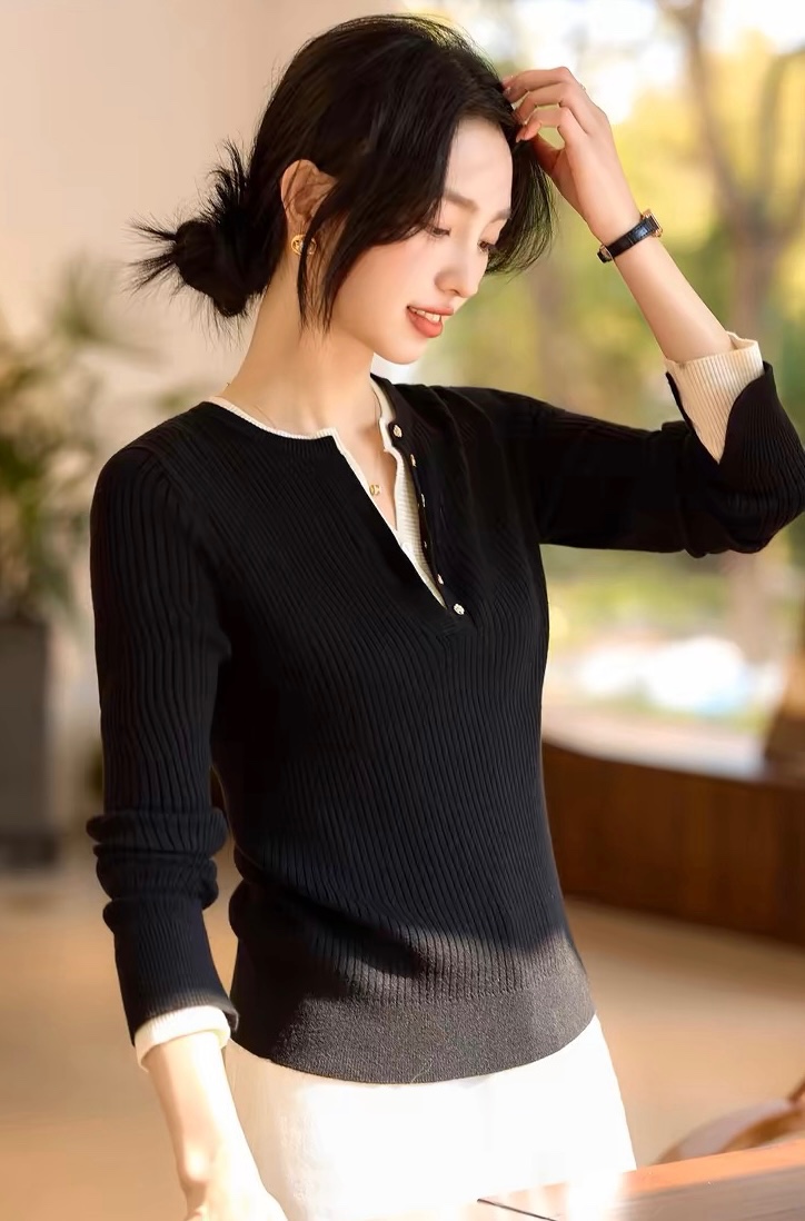 Slim-fitting Fake Two-piece Women's Large V-neck Knitted Bottoming Shirt