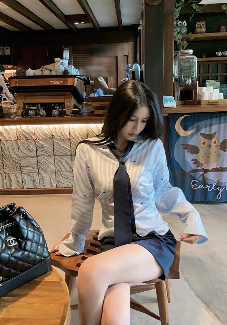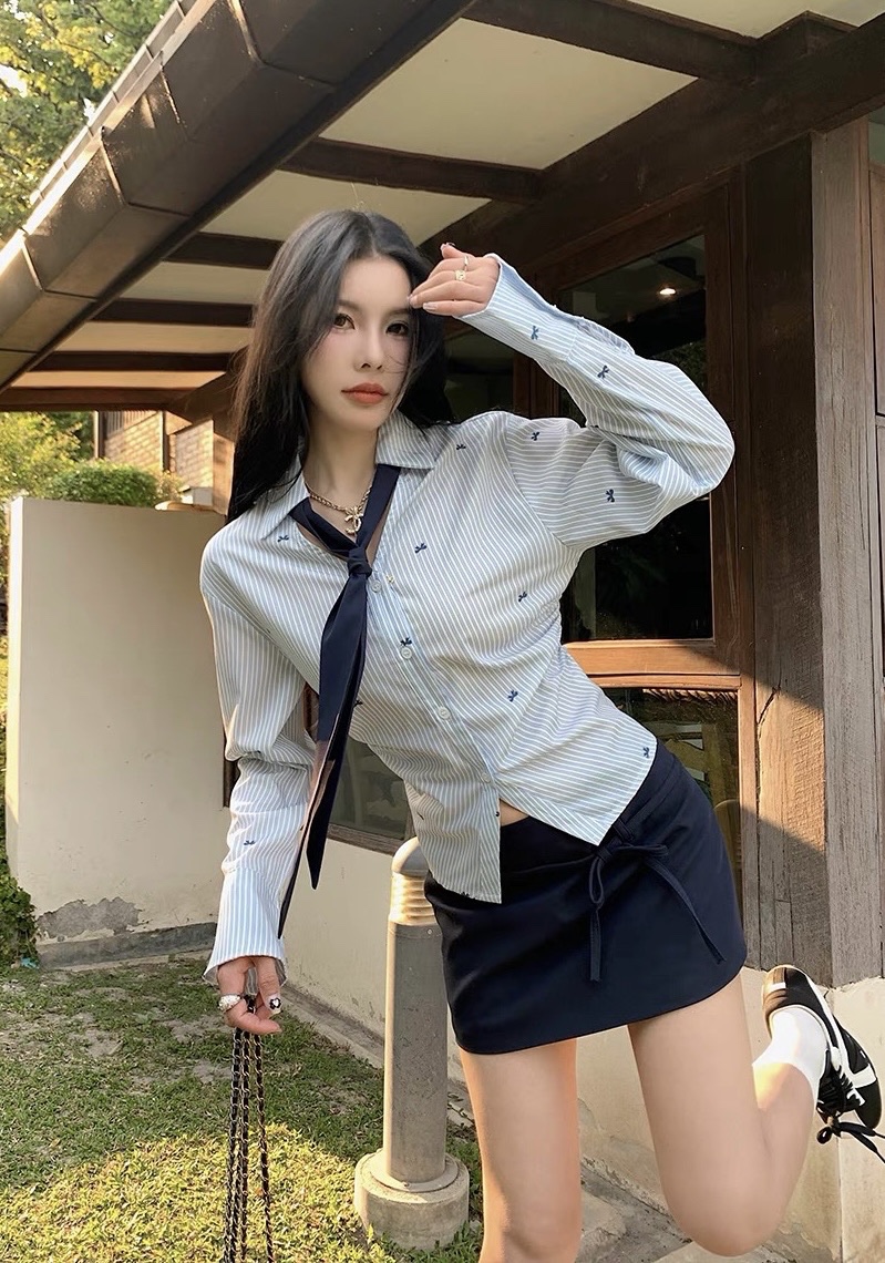 The top is thin, with flared sleeves, commuter style, and a Polo collar.