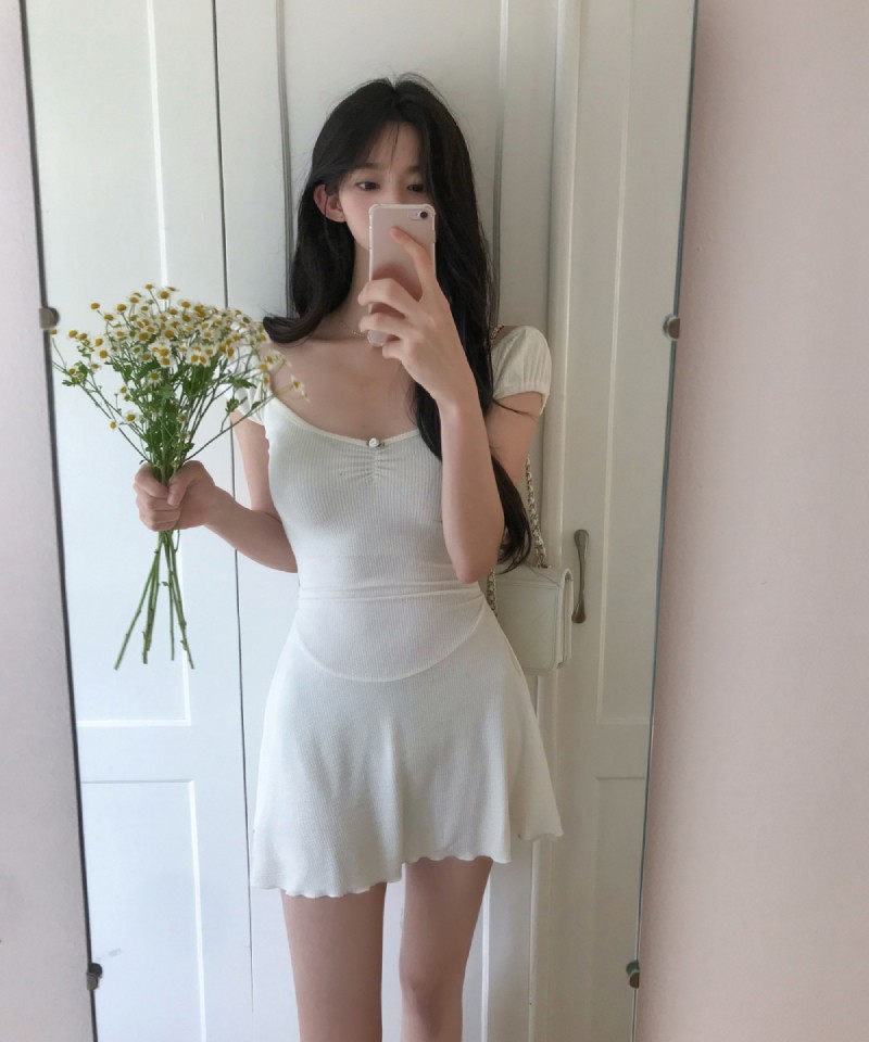 Shirring details on the square neckline define the upper body, enhancing volume and making the shoulders appear slimmer.