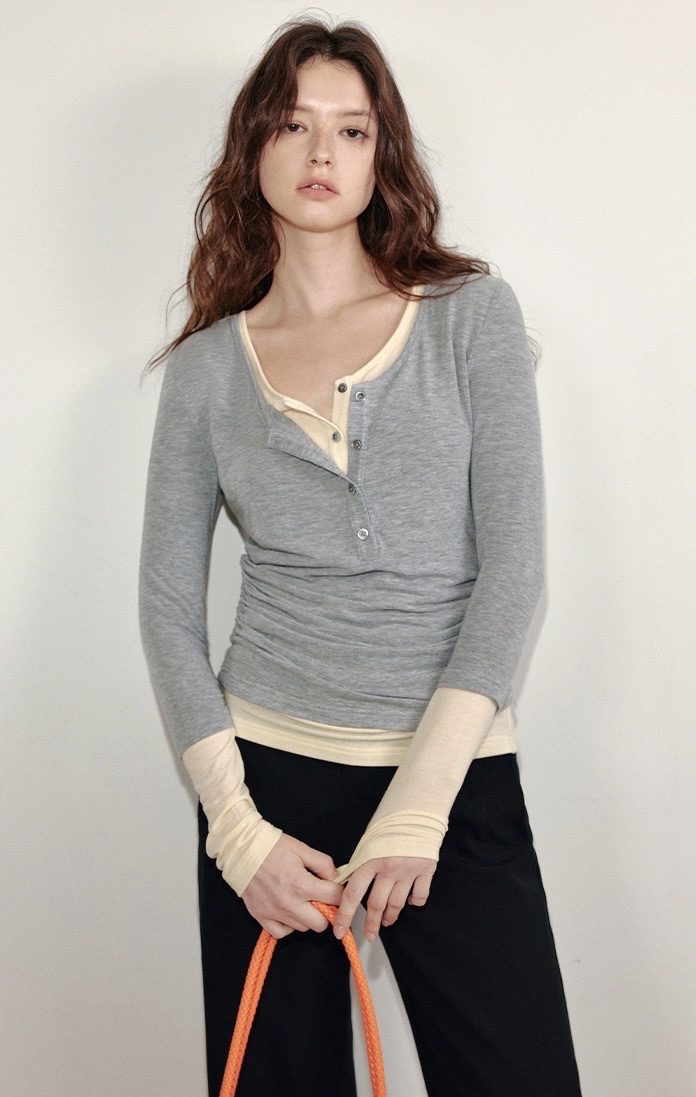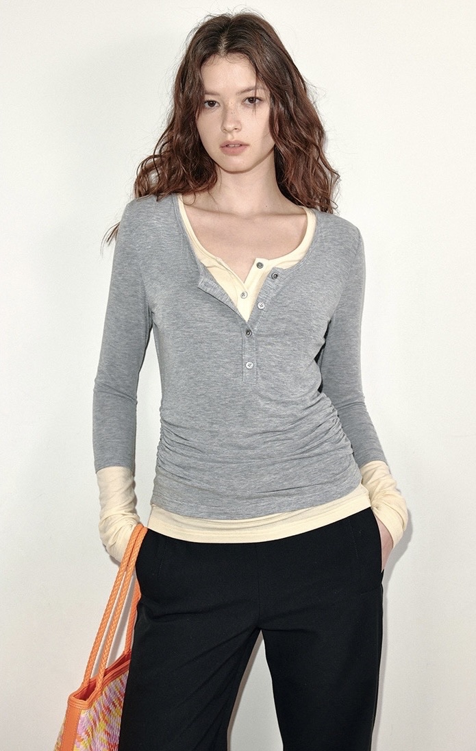 Whether worn alone or with a suit or windbreaker, the fake two-piece T-shirt can be the finishing touch. The pleated design at the waist outlines the slender waist and shows the soft curve.